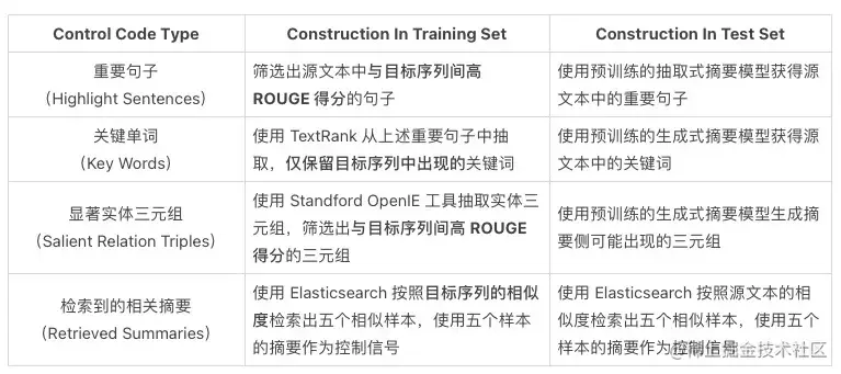为了保证控制信号与目标序列中存在可被捕捉的联系,实现摘要内容的可控,如何获取控制信号就显得尤为重要,即所构造的控制信号必须与目标序列高度相关。GSum 的训练和测试数据集中的控制信号的获取方式如下表所示: