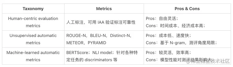 从上表我们可以看出,人工评价指标虽然灵活,不适合用于对海量样本评价。而无监督的自动评价指标,虽然能低成本地解决评测问题,但能够完成评价的角度甚少。“用模型来衡量模型”则是效率和灵活性之间的 trade-off。