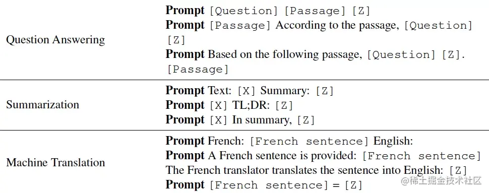 图3:不同任务下常用的 prompts,[X] 是源文本,[Z] 是以期生成的答案