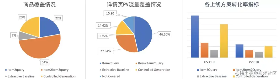 目前,详情页底纹推荐模块上线的四种方案包括,Item2Query 基于点击行为使用 TF-IDF 关联商品的重要 Query 作为底纹,Item2Item2Query 基于主图相似度关联到的相似商品共享底纹,按照热门实体类型从标题中抽取实体的抽取式基线模型,以及我们的可控 Query 生成模型。上线后的指标也显示,在 CTR 指标上,可控生成提供的 Query 的转化率仅次于 Item2Query 基于行为关联到的 Query。