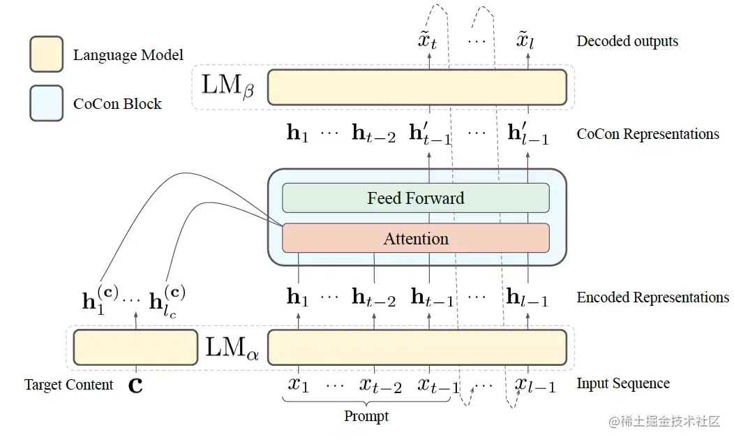 通过设计损失函数来建模控制条件与目标输出之间联系的典型例子,是 CoCon(Content Conditioner)。结构上,CoCon 在 GPT-2 medium 的前 7 层和后 17 层之间一个 CoCon block,包括 Layer Normalization、Multihead Cross Attention 和 Feed Forward Networks。模型整体接受源文本输入后,利用 CoCon 模块引入控制条件信息,再做自回归解码以生成文本。