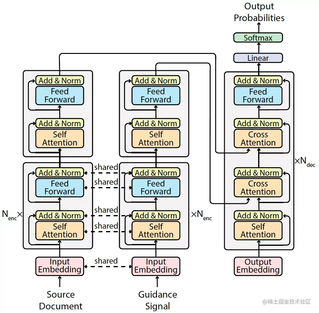 GSum(Guided Summarization)引入了四种控制信号,包括重要句子、关键单词、显著实体三元组,以及检索到的相关摘要。结构上,GSum 基于 Transformer 改进。源文本和文本类型的控制信号共享编码器,在编码器顶层两者各自有一层专属编码器。解码器部分包含两个 Multihead Cross Attention 分别关注源文本编码和引导信号编码。