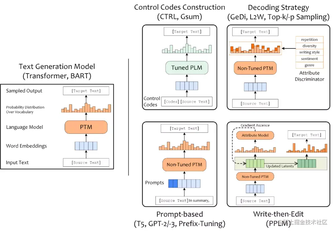 构造 Control Codes 指的是引入一些符号或文本作为条件,训练条件语言模型;为预训练语言模型设计 Prompt 也能实现对 PLM 所执行文本任务的控制;通过在解码阶段使用采样策略,也能够采样出具有特定属性的文本;最后,Write-then-Edit 指的是 PPLM 引入属性判别模型来根据产生的草稿计算梯度并反向传播,基于更新后的隐含状态来产生最终文本序列。