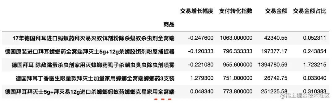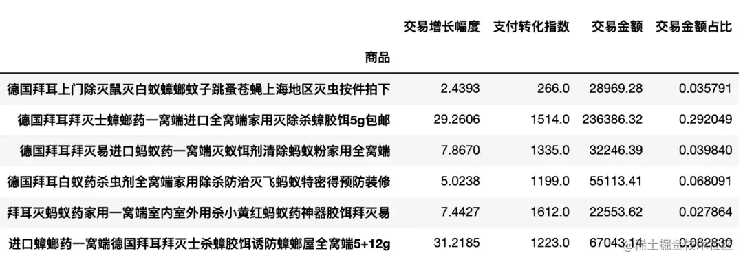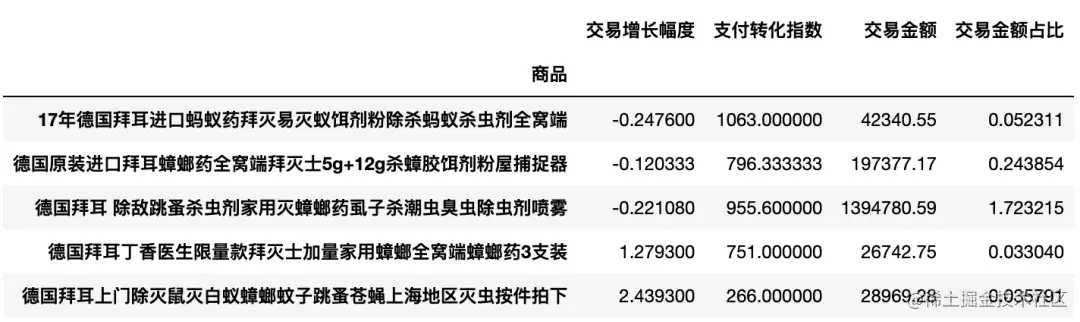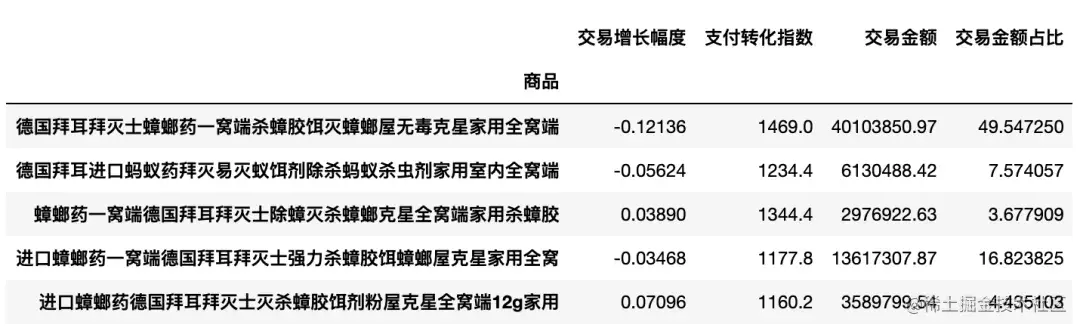 以单个商品为聚合,分别对交易增长幅度求平均,支付转化指数求平局,交易金额求和,这些只需要一行代码就能搞定。