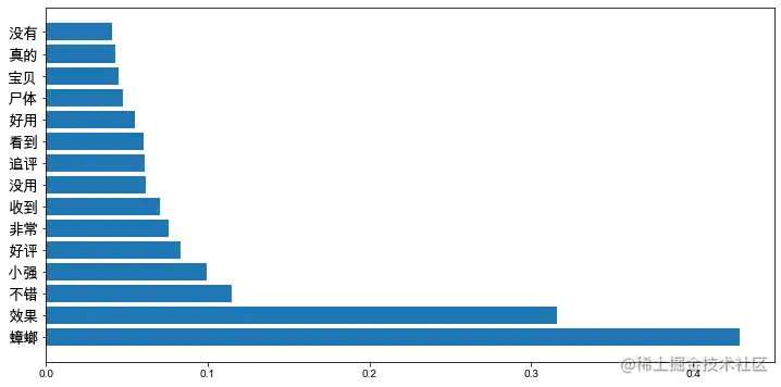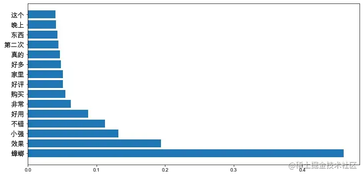 为了更加方便分析结果。我们将上面15个主题进行可视化分析。简单地绘制了如下横向柱状图。