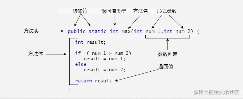 修饰符 返回值类型 方法名(参数类型 参数名){ ... 方法体 ... return 返回值; }