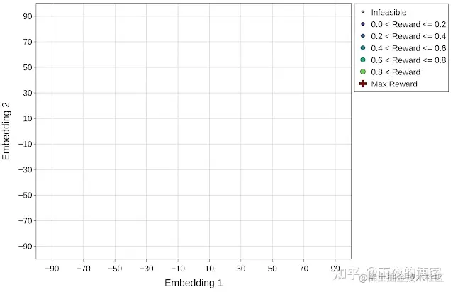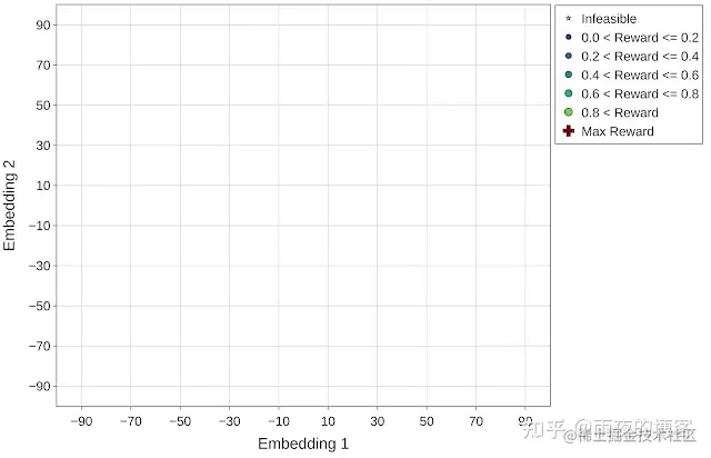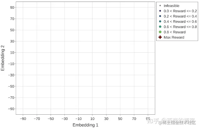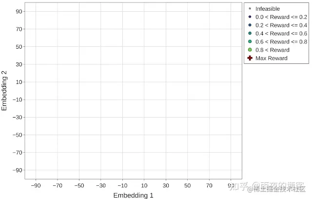为了更好地可视化每个优化策略在加速器搜索空间导航中的有效性,我们使用t 分布随机邻居嵌入 (t-SNE) 将探索的配置映射到优化范围内的二维空间。所有实验的目标(奖励)定义为每个加速器区域的吞吐量(推理/秒)。在下图中,x轴和y轴表示嵌入空间的 t-SNE 组件(嵌入 1 和嵌入 2)。星形和圆形标记分别显示不可行(零奖励)和可行设计点,可行点的大小与其奖励相对应。