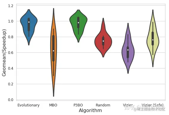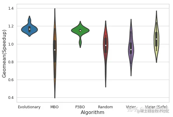 小提琴图显示了在 6.8 mm 2的面积预算下经过 4K 试验评估后,在 10 个优化策略中运行的最大可实现奖励的完整分布。P3BO 和 Evolutionary 算法产生了更多的高性能设计(更宽的部分)。x 轴和 y 轴分别表示研究的优化算法和基准加速器上加速(奖励)的几何平均值。