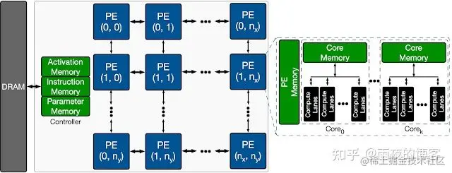 下图显示了目标 ML 加速器的整体架构搜索空间。加速器包含处理元件 (PE) 的二维阵列,每个处理元件以单指令多数据(SIMD) 方式执行一组算术计算。每个 PE 的主要架构组件是处理核心,包括用于 SIMD 操作的多个计算通道。每个 PE在其所有计算核心之间具有共享内存 ( PE Memory ),主要用于存储模型激活、部分结果和输出,而单个核心具有主要用于存储模型参数的内存。每个内核有多个计算通道,具有多路乘法累加(MAC) 单位。每个周期的模型计算结果要么存储在 PE 内存中以供进一步计算,要么卸载回 DRAM。