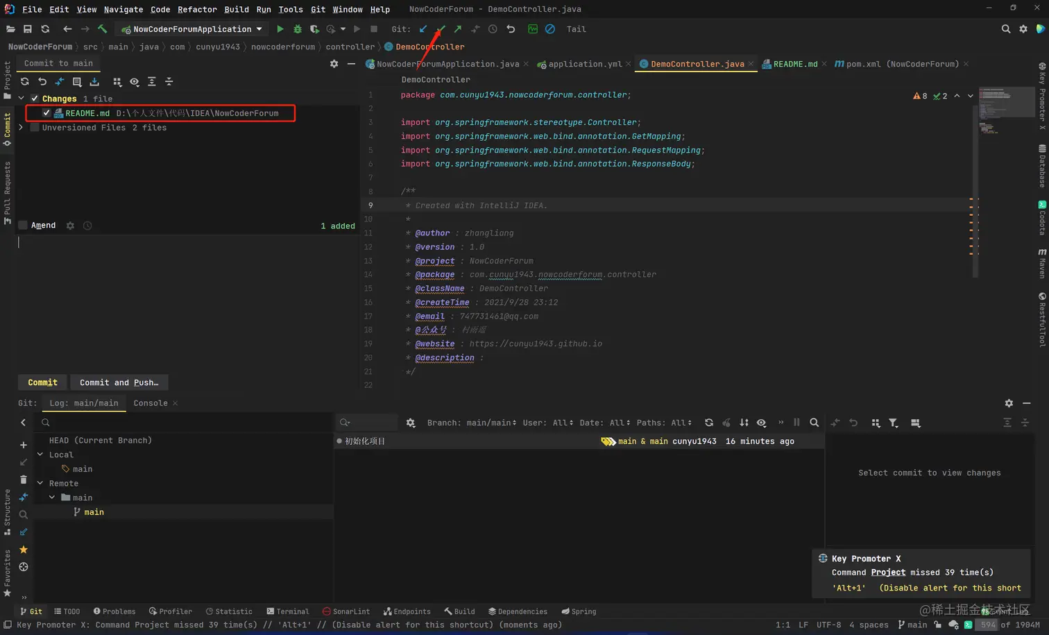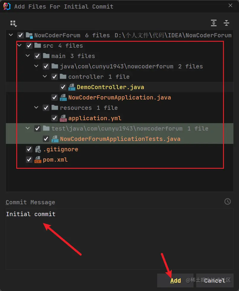 - 等待一会儿,IDEA 会指定弹出以下窗口。这里主要供我们选择所要推送到远程的文件,以及提交信息,确认好两者之后,最后点击