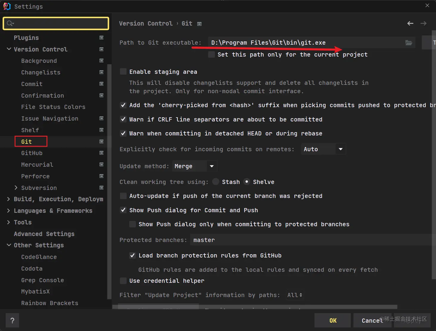 - 在 IDEA 中设置 Git 安装的路径,一般 IDEA 是会自动检测你的 Git 所在目录的,如果没有自动检测出来,就需要我们自己去找到安装好的 Git 的路径;