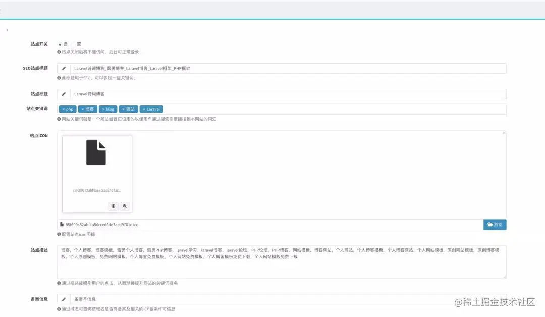 网站配置页面可以设置网站的一些全局配置,比如站点名称、站点描述、尾部座右铭等等