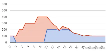 在此图表中,蓝色表示请求成功,而红色表示失败,稍后需要重试。 该服务从 0 时间标记开始离线十秒钟,因此在 0 到 10 之间的所有请求都是红色的。 如您所见,这看起来很糟糕。 当服务准备好重新上线时,请求和重试的数量迅速增加到惊人的每秒 1000 个请求,但新请求继续以正常的速度不断涌来,因此在重新上线后的第一秒内,服务队列中就有1100个请求,这导致它被锁定在每秒最多处理 200 个请求的情况下,再持续 10 秒才能赶上积压的请求,同时不断以平均每秒 100 个的速度接收新请求。