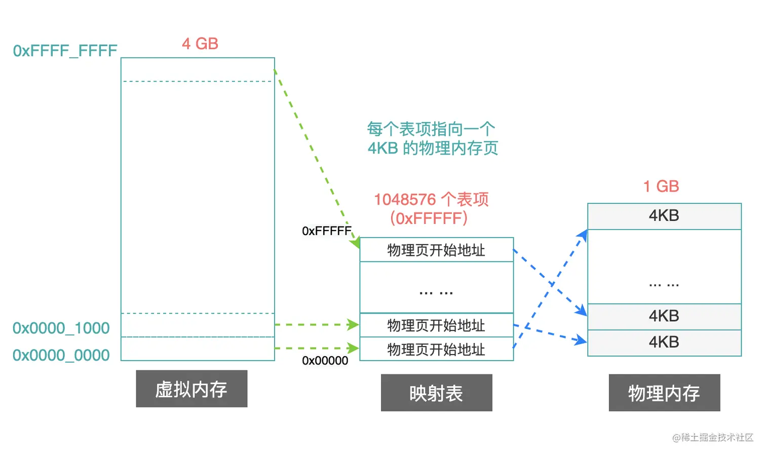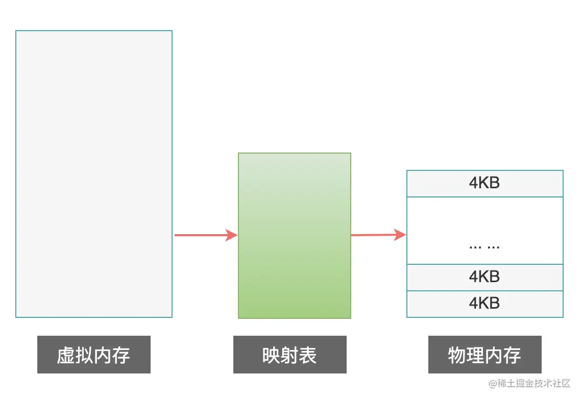在内存管理上,新加的这一层就是虚拟内存:把物理内存按照一个固定的单位(4 KB,称作一个物理页)进行分割,然后把连续的虚拟内存,映射到若干个不连续的物理内存页。