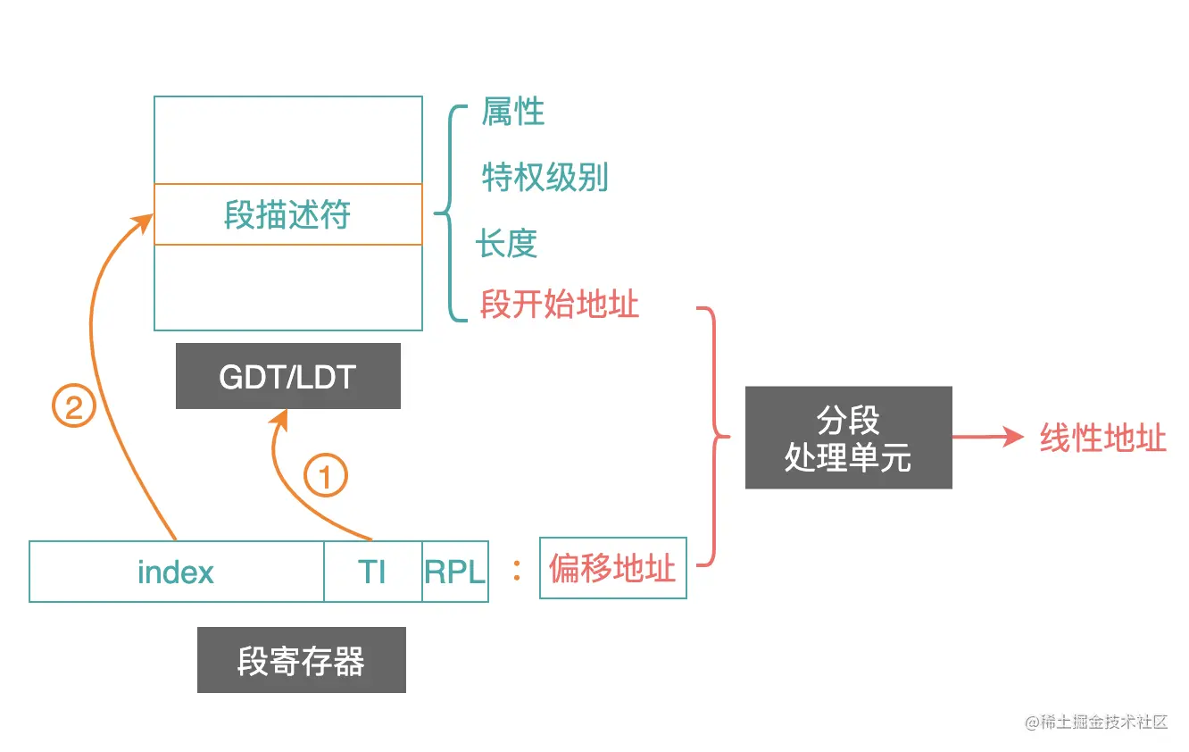 经过分段处理单元的权限检查和计算,这个开始地址加上偏移量,就是一个线性地址,如下图所示: