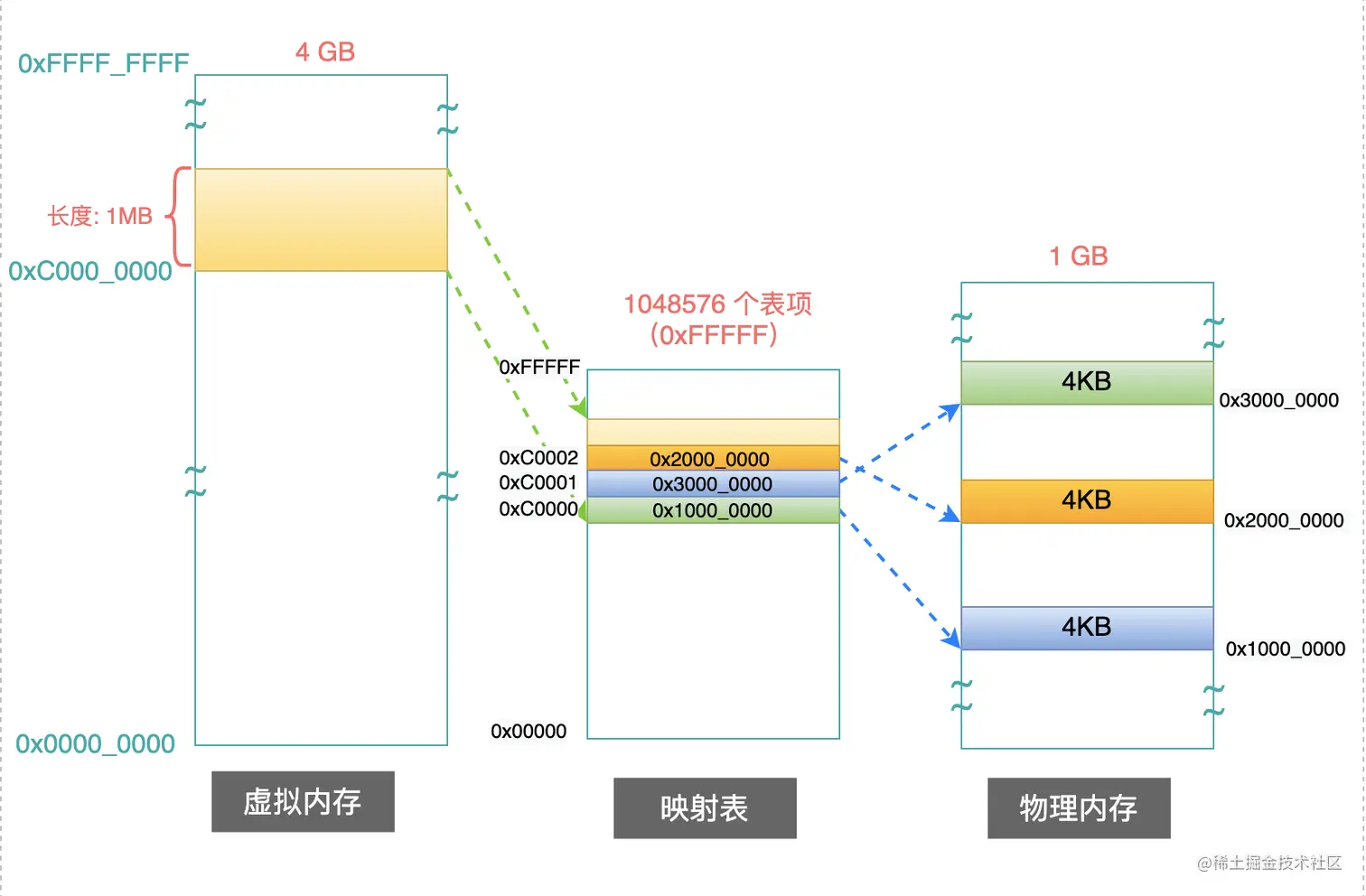 那么对于我们要寻找的线性地址 0xC000_2020,对应的表项索引号是 0xC0002,这个表项中记录的物理内存页的开始地址是 0x2000_0000(距离开始地址 512 MB)。