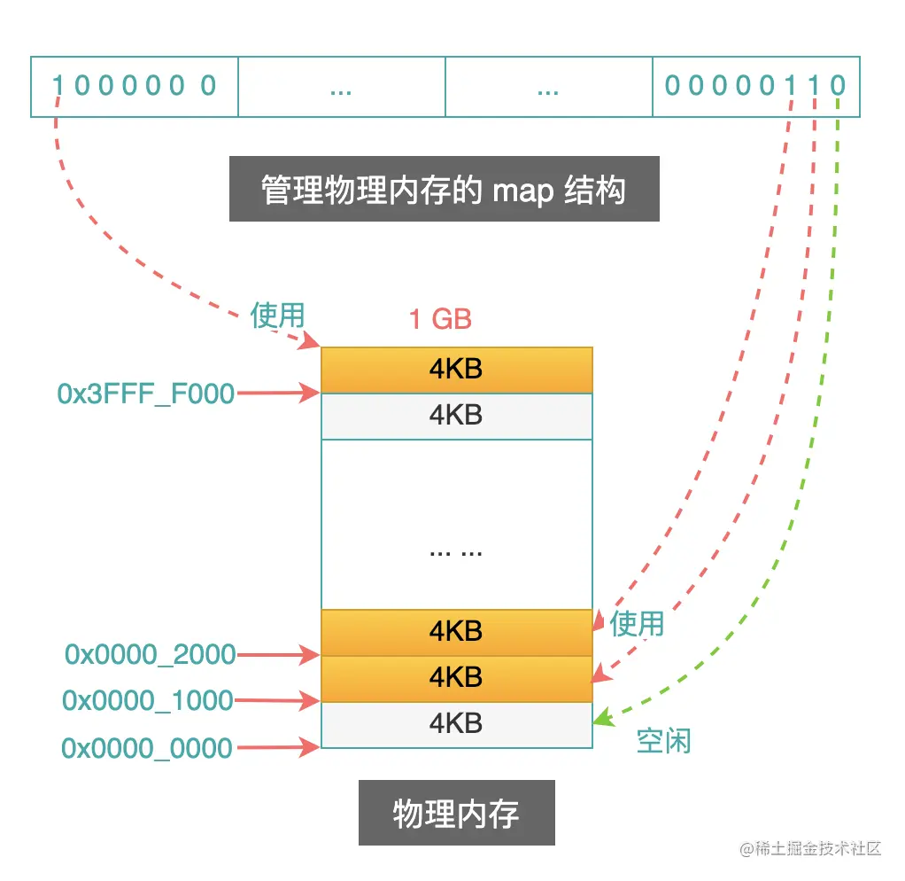 利用map结构,操作系统就知道当前: 哪些物理页正在被使用,哪些物理页是空闲的。