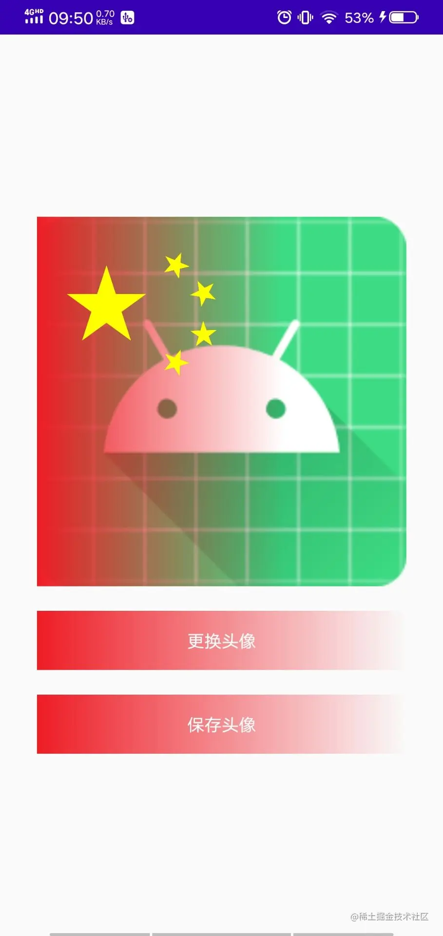 这样简单的国庆头像就简单完成了,除了选择图片和保存图片代码稍微多一点,其他重要的也就是布局中的背景渐变了。