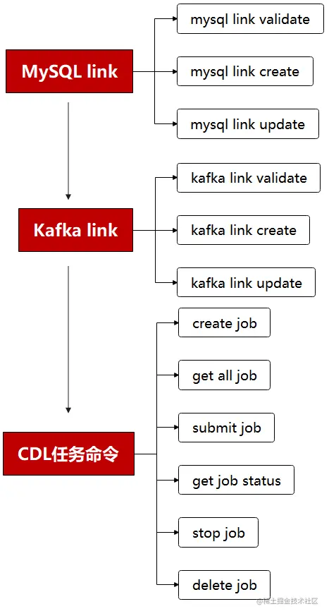说明:需要先创建一个MySQL link, 在创建一个Kafka link, 然后再创建一个CDL同步任务并启动。