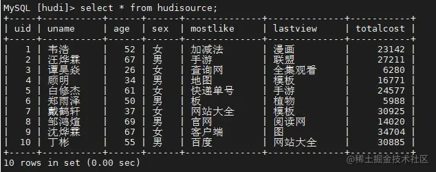 删除操作:delete from hudi.hudisource where uid=11;