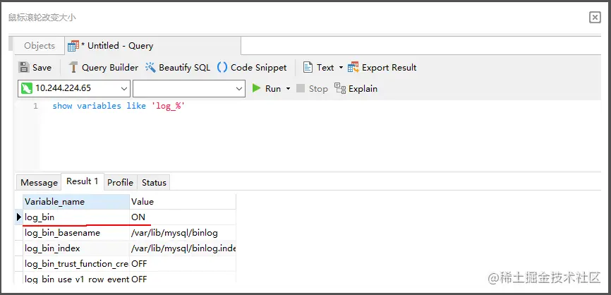 例如在navicat工具选择"File> New Query"新建查询,输入如下SQL命令,单击"Run"在结果中"log_bin"显示为"ON"则表示开启成功。