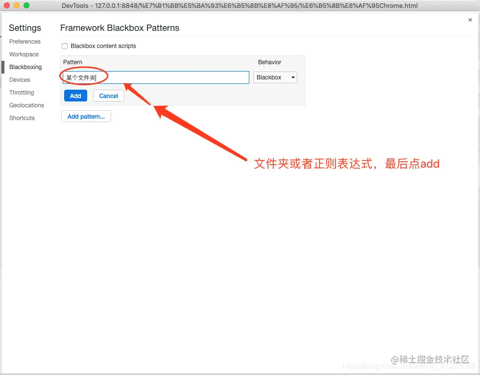 转到Chrome设置页面,然后转到 Blackboxing 并单击 Add Pattern… 并输入您想要加入 Blackbox 的正则,在您想要过滤大量脚本时很有用。