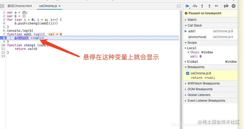 还可以在断点周围利用鼠标悬停,即可查看变量的值