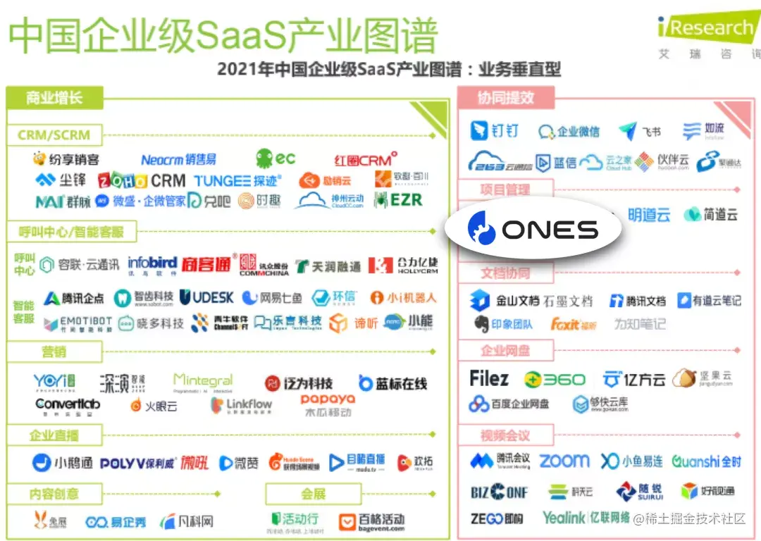 近日,艾瑞咨询发布**《2021年中国企业级 SaaS 行业研究报告****》(下称“该报告”)。其中,该报告选取 ONES 作为「典型厂商案例」之一**,剖析了 ONES 在协同提效方面所做出的成绩。