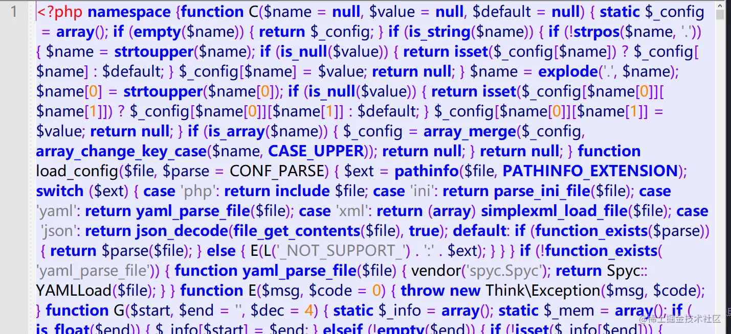 会将整个框架整合进 Application/Runtime/``common~runtime.php 文件中,后续的执行都在这个74kb,且只有一行代码的文件中。
