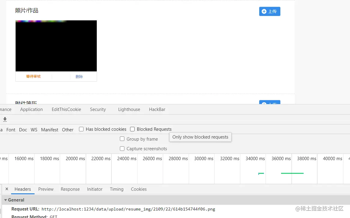 当在修改简历处上传文件时,后面存在一个ajax请求,获取我们的图片,这样就暴露了图片的存储位置。