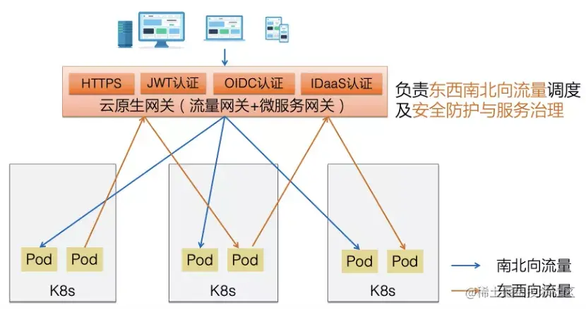 流量网关(如 Nignx )是指提供全局性的、与后端业务应用无关的策略,如 HTTPS 证书卸载、Web 防火墙、全局流量监控等;微服务网关(如 Spring Cloud Gateway )是指与业务紧耦合的、提供单个业务域级别的策略,如服务治理、身份认证等。
