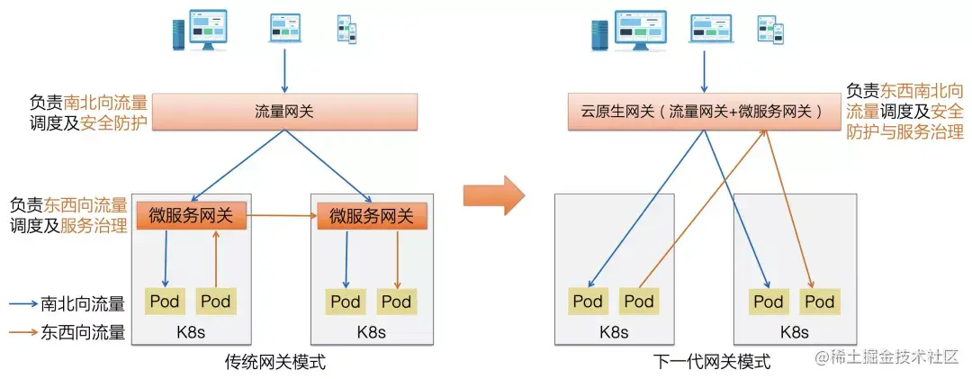 在虚拟化时期的微服务架构下,业务通常采用流量网关 + 微服务网关的两层架构,流量网关负责南北向流量调度和安全防护,微服务网关负责东西向流量调度和服务治理,而在容器和 K8s 主导的云原生时代,Ingress 成为 K8s 生态的网关标准,赋予了网关新的使命,使得流量网关 + 微服务网关合二为一成为可能。