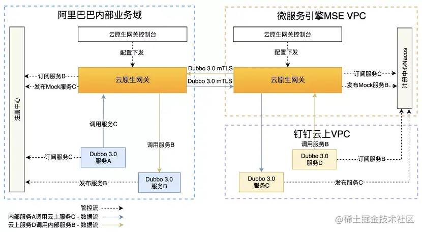 Envoy 是最受 K8s 社区欢迎的 Ingress 实现之一,正成为云原生时代流量入口的标准技术方案。MSE 云原生网关依托于 Envoy 和 Istio 进行构建,实现了统一的控制面管控,并直连后端服务,支持了 Dubbo3.0、Nacos,打通阿里云容器服务ACK,自动同步服务注册信息。MSE 云原生网关对 Dubbo 3.0 与 Nacos 的支持,已经率先在钉钉业务中上线,下图是钉钉 Dubbo 3.0 落地的部署简图如下: