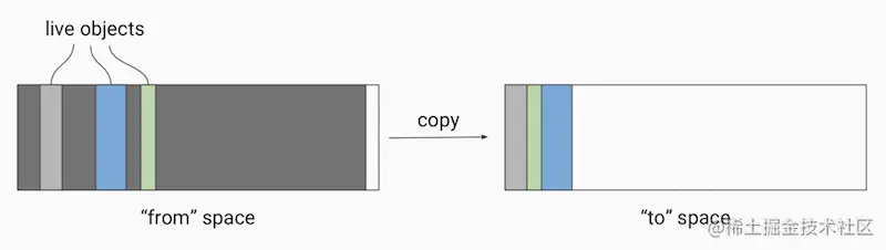 Dart中类似线程的概念叫做Isolate,每个Isolate之间是无法共享内存的,所以这种分配策略可以让Dart实现无锁的快速分配。 Dart的垃圾回收也采用了多生代算法,新生代在回收内存时采用了“半空间”算法,触发垃圾回收时Dart会将当前半空间中的“活跃”对象拷贝到备用空间,然后整体释放当前空间的所有内存: