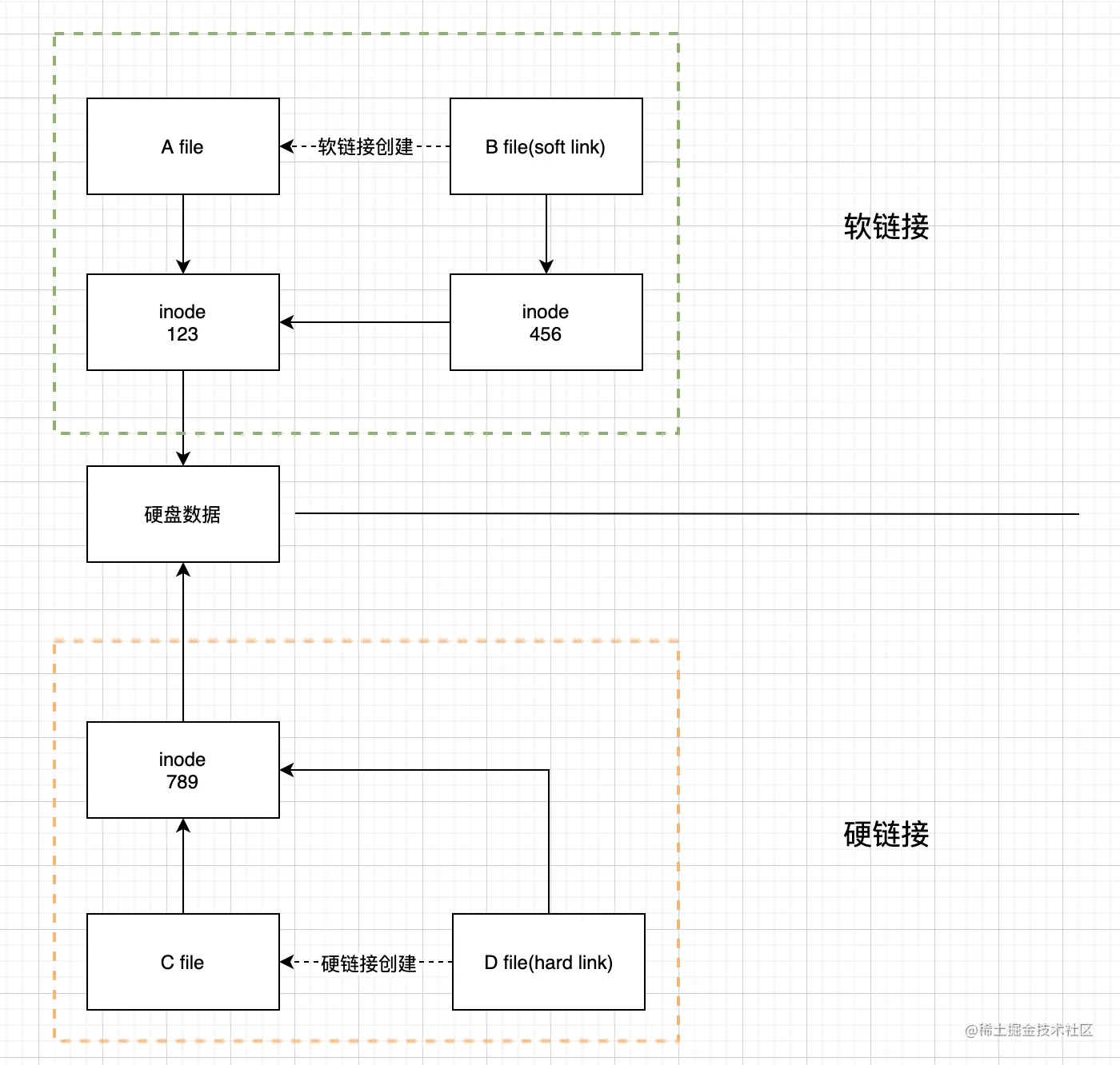 inode,和源文件共用同一个inode;软链接会创建额外一个文件和inode,但是软链接文件inode指向源文件的inode; - 建立硬链接时,