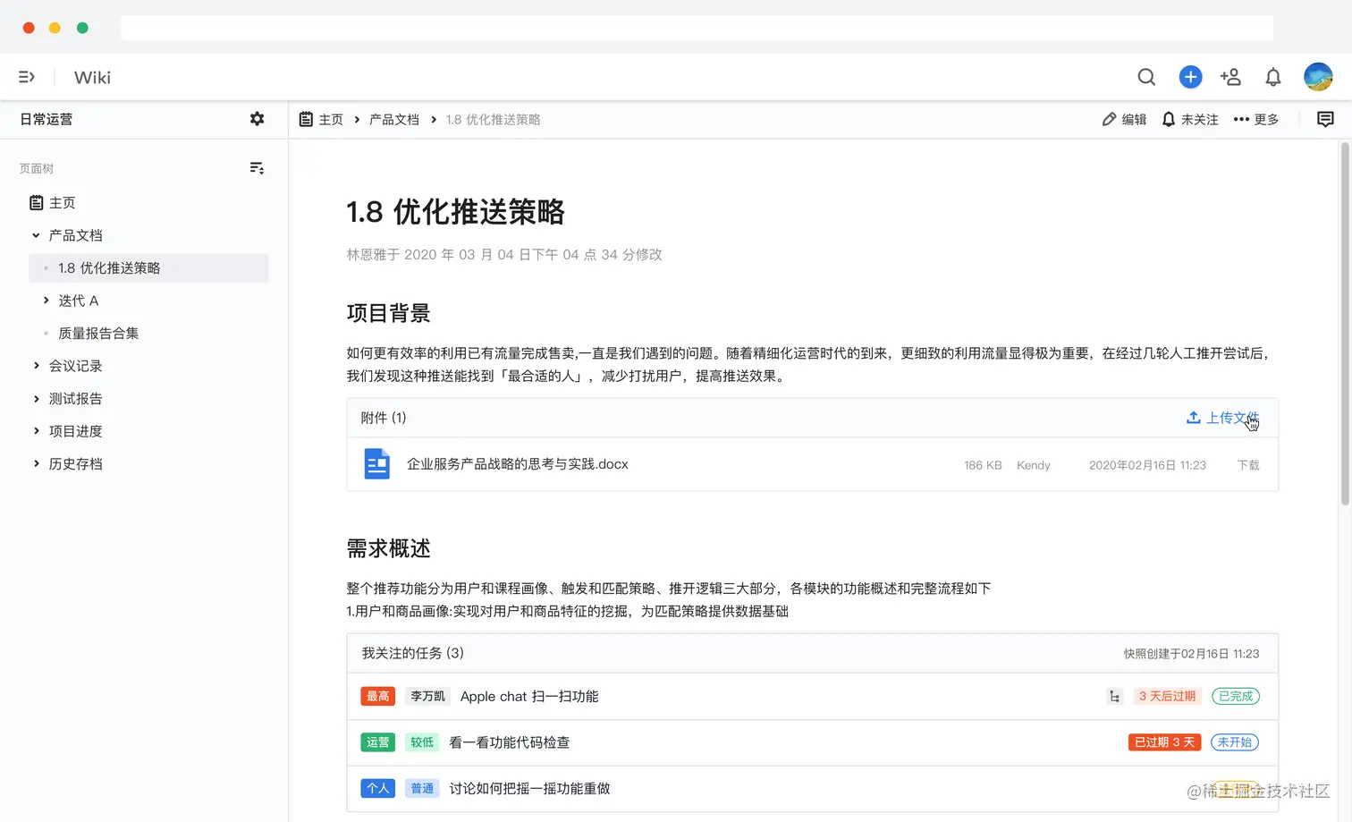 每次回顾会议中产生的重要文档可以沉淀在 ONES Wiki 中,形成团队知识库,为其他团队及后续的迭代提供经验参考,鼓励团队持续改进。