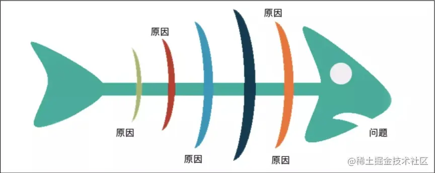 鱼骨图将因果关系可视化,帮助团队分析造成不利影响的多个潜在原因,适用于持续改进。在鱼骨图中,问题出在鱼的头部,而造成问题的原因就是鱼的肋骨,大骨表示的是主要原因,中骨表示子原因,通过反复问「为什么」不断向下钻取,寻找原因,解决问题。