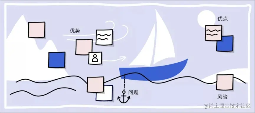 通过「帆船回顾」来分析迭代中的优势、劣势和风险等,其中: