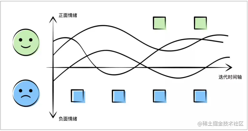 迭代心情曲线的横轴是时间轴,表示「迭代」的时间跨度;纵轴是情绪轴,上面的象限属于积极情绪,下面的象限属于消极情绪。