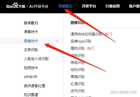 第一步:搜索百度AI进官网找到:开放能力——》图像技术。