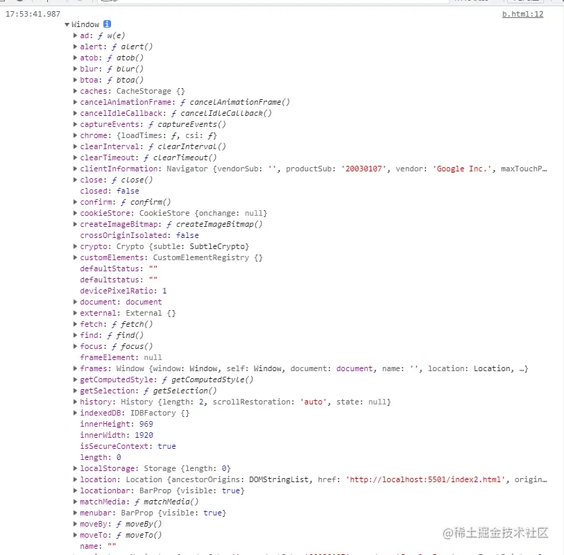 我们接着说:点击 a.html 链接跳转到 b.html ,此时b里面可以访问到a里面的整个window对象,是可以引用到的。