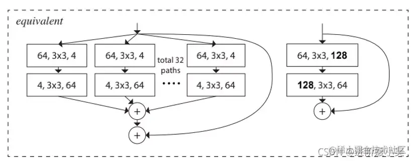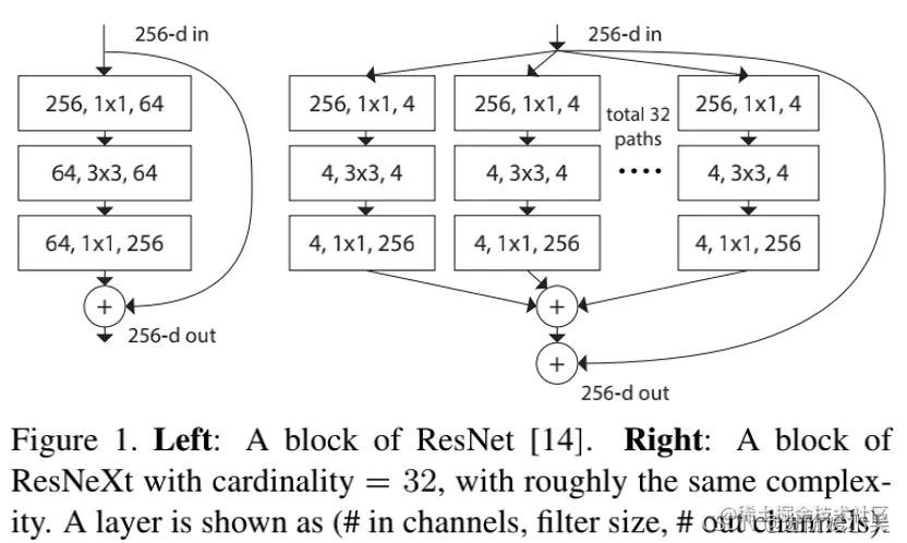 网络 ResNeXt,同时采用 VGG 堆叠的思想和 Inception 的 split-transform-merge 思想,但是可扩展性比较强,可以认为是在增加准确率的同时基本不改变或降低模型的复杂度。这里提到一个名词cardinality,原文的解释是the size of the set of transformations,如下图 Fig1 右边是 cardinality=32 的样子,这里注意每个被聚合的拓扑结构都是一样的(这也是和 Inception 的差别,减轻设计负担)。