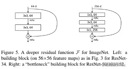 ImageNet 的更深的残差函数 F。左图:ResNet-34 的积木块(在 56×56 特征图上),如下图所示。右图:ResNet-50/101/152 的“瓶颈”构建块。