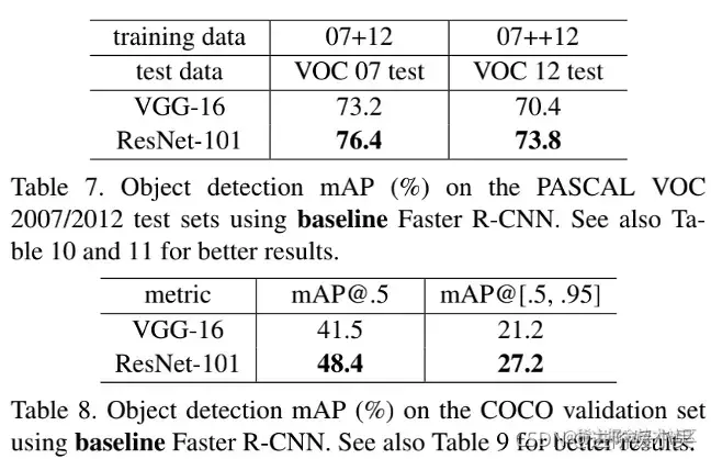 5、ResNet在目标分类上有了非常好的泛化性能,作者将它应用到目标检测领域,将Faster R-CNN的基础网络用VGG-16与ResNet-101对比,性能均有大幅提升。
