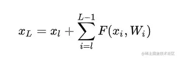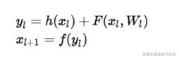其中 x_{l} 和 x_{l+1} 分别表示的是第 l 个残差单元的输入和输出,注意每个残差单元一般包含多层结构。F 是残差函数,表示学习到的残差,而h表示恒等映射, f 是ReLU激活函数。基于上式,我们求得从浅层 l 到深层 L 的学习特征为:
