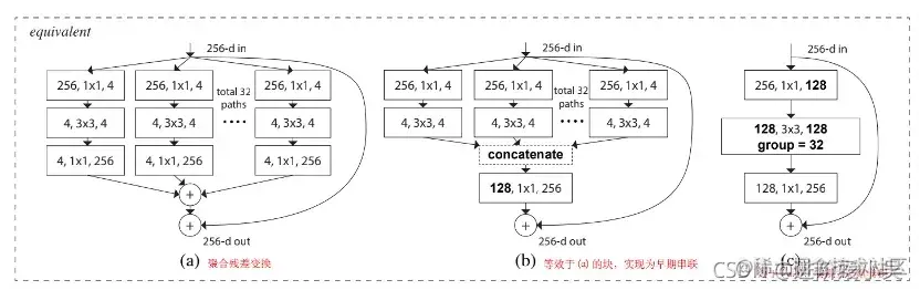ResNeXt的等效构建块。(a):聚合残差变换,与图1右侧相同。(b):等效于(a)的块,实现为早期串联。(c):等效于(a,b),实现为分组卷积。加粗的符号突出了重新制定的变化。一层表示为(#输入通道,过滤器大小,#输出通道)。