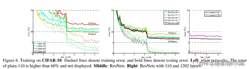4、作者测试了1000层的残差网络,测试结果比110层更差,但是训练误差却与110层相似,造成这种现象应该是过拟合,对于小型的数据集,1000多层的网络属于杀鸡牛刀了,如果真的需要用到这么深的网络,可能需要更强的正则化。