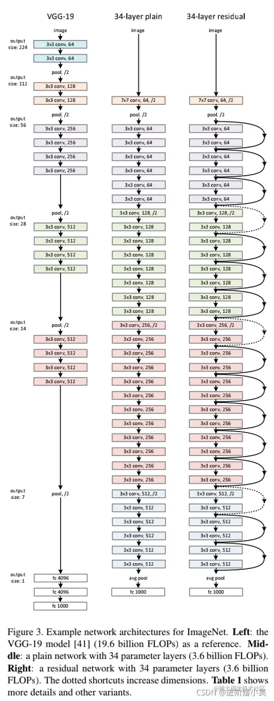 我们的模型与VGG网络相比,有更少的滤波器和更低的复杂度。我们的34层基准有36亿FLOP(乘加),仅是VGG-19(196亿FLOP)的18%。
